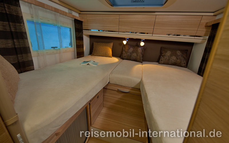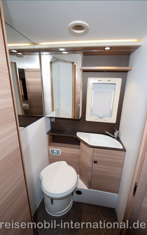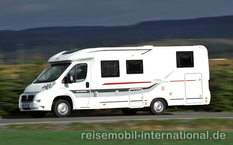 Sportlich ist der erste Eindruck des 7,38 Meter langen Testmobils Adria Coral Plus 670 SL: Mit 2,69 Metern Höhe ist das teilintegrierte Wohnmobil auf Fiat-Ducato-Chassis ganze 10 cm niedriger als das Vorjahrsmodell. „Dynamisch“ wirken neben der windschnittigen Dachhutze auch das Heck mit markantem Stoßfänger und Spoiler. Den guten Eindruck bestätigen die „professionelle“ Abdichtung des Aufbaus, die leicht schließende Aufbautür und zwei Schlösser. Im Boden ist „vollständig isoliert in einer beheizten Kunststoffwanne“ der Abwassertankt untergebracht. Serienmäßig stattet Adria die Dachhutze mit einem großen Dachfenster aus, das im Inneren für viel Licht sorgt. Die Tester zeigen sich begeistert vom neuen, „nahezu spektakulären“ Interieur. Das „dezent abgerundete Mobiliar“ gefällt optisch und haptisch und punktet mit „perfekt eingepassten“ Möbeln. Im Bug lassen sich Fahrer- und Beifahrersitz drehen, um mit einer L-Sitzgruppe und einem Einzelsitz hinter dem Beifahrer Platz für maximal 5 Personen um den drehbaren Tisch zu schaffen. Der Einzelsitz ist mit einem Beckengurt ausgestattet und bietet einen sicheren fünften Sitz mit Rücken zur Fahrtrichtung. Abstriche in puncto Bequemlichkeit müssen Reisende auf den Sitzbänken machen, denn die senkrechte Lehne „zwingt die Mitfahrer zu unbequemer Haltung“. In der L-Küche mit elektrisch zündendem Dreiflamm-Kocher findet sich für alle Utensilien genügend Platz. Serienmäßig baut Adria im Coral Plus 670 SL einen 150-Liter-Kühlschrank ein. Das geräumige Bad und die Dusche liegen einander gegenüber und können dank einer Tür zum Wohnbereich zu einem Raumbad zusammengelegt werden. Im Heck sind die beiden Einzelbetten mit dicken Matratzen und Lattenrosten über zwei Stufen leicht erreichbar, mit wenigen Handgriffen lassen sie sich zu einer großen Liegewiese umbauen. Unter den Betten lassen sich Kleider und Wäsche verstauen. Viel Stauraum bietet die durchladbare Fahrradgarage, die Adria mit fest verankerten Zurrösen ausstattet. Innen gibt nur die wechselnde Stehhöhe Anlass zu Kritik: Sie variiert zwischen 178 und 198 cm, so dass größere Caravaning-Fans den Kopf gelegentlich einziehen müssen. Das neue Kontroll-Panel mit Touchscreen-Benutzeroberfläche gefällt den Profis. Auch bei der Fahrt macht das Wohnmobil Adria Coral Plus 670 SL eine gute Figur: „Nach kürzerer Eingewöhnungsphase lässt sich das Reisemobil leicht manövrieren. Beim Rangieren sollte der Fahrer allerdings den stattlichen Hecküberhang von 238 Zentimetern nicht außer Acht lassen.“ Der Gesamteindruck überzeugt die Profis: Das mit Sonderausstattung 64.741 Euro teure Testmodell Adria Coral Plus 670 SL, im Grundpreis ab 56.399 Euro erhältlich, kommt in „ sehr guter Verarbeitungsqualität“ und besitzt ein „üppiges Stauraumangebot und eine umfangreiche Serienausstattung“. In der Kategorie Teilintegrierte bis 60.000 Euro vergeben die Profis 128 von 200 möglichen Punkten.