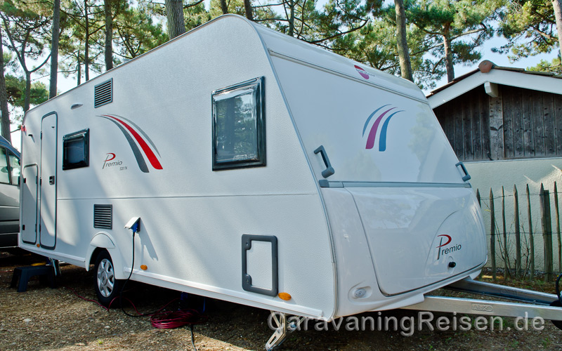 Äußerlich kommt der Premio 520 TK in traditionellem Hammerschlag ohne viel Design daher. Dafür hat der Aufbau innere Werte. So hat der Bürstner Premio 520 TK einen GfK- anstatt eines Holzbodens. Das ist robust und spart Gewicht. Trotz seiner Größe kann der Wohnwagen daher mit einem zulässigen Gesamtgewicht von „nur“ 1.500 Kilogramm aufwarten und dabei noch 320 Kilogramm Zuladungskapazität bereithalten. Wer mehr mitnehmen will, kann den Premio 520 TK bis zu 1.700 Kilogramm auflasten. Ebenfalls serienmäßig sind das AL-KO Sicherheitsfahrwerk und die Anti-Schlinger-Kupplung AKS 3004. Angesichts seiner Größe ein durchaus beruhigendes Feature. Denn in großen Wohnwagen wohnt es sich gemütlich, aber es fährt sich damit anspruchsvoll. Vor allem die Breite macht so manche Autobahnbaustelle und Ortsdurchfahrt eng. Da ist es schön zu spüren, dass nicht jede Bodenwelle für einen kleinen Schlenker sorgt. Auch das Fahren und Rangieren auf dem Campingplatz stellt mit den 7,48 Metern Gesamtlänge und 2,5 Metern Breite gewisse Anforderungen. Dabei hätten wir gerne auf 20 Zentimeter Breite verzichtet und den gleichen Grundriss in 2,30 Metern Breite gehabt. Den gibt es in der Premio Baureihe aber nicht, sondern nur in der rund 3.000 Euro teureren Averso Variante.