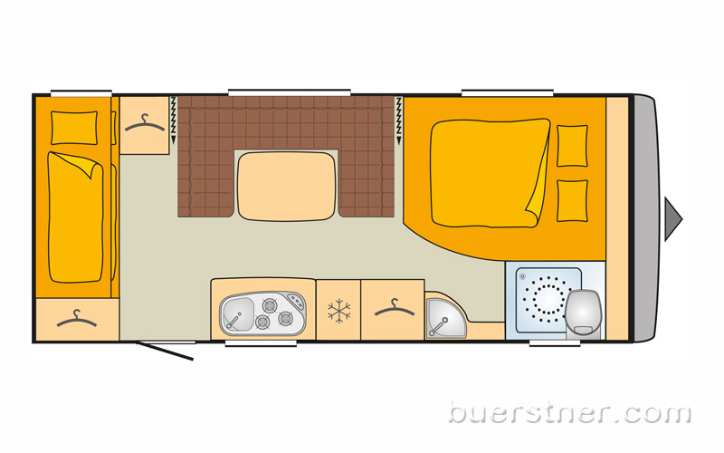 Steht der Premio 520 TK erst einmal an Ort und Stelle, legt er schnell den Schluss nahe, mehr Wohnwagen müsse nicht sein. Das Raumangebot ist für vier Personen üppig, die Betten sind groß und bequem. Stauraum ist unter dem unteren Etagenbett und dem Doppelbett im Bug auch für sperrige Dinge reichlich vorhanden. Während der Fahrt entsteht durch Hochklappen des unteren Etagenbettes eine kleine Heckgarage, die über eine Außenklappe zugänglich ist. Die Kinder haben ihren eigenen Kleiderschrank. Kinderzimmer und Schlafbereich sind mit Vorhängen abtrennbar. Das Bad ist komplett und zweckmäßig. Waschbecken und Spiegel sind im Schlafbereich untergebracht, die Toilette, in der gegen Aufpreis auch mit Vorhang geduscht werden kann, ist mit einer Tür abgetrennt. Die Sitzgruppe bietet bis zu sechs Personen Platz und auf der Längsbank kann man auch mal die Beine hochlegen. Besonders positiv fiel der große Kühlschrank auf. 142 Liter ist ja zunächst nur ein technischer Wert, aber die Aufteilung der Fächer ist praktisch und bietet auch großen Flaschen und Verpackungen viel Raum. Wer gerne in südlichen Ländern regionale Spezialitäten genießt und reichlich einkauft, wird an diesem Kühlschrank seine Freude haben. Nur Standard ist hingegen die Küche. Herd und Spüle sind bewährte und praktische Modelle. Die Arbeitsfläche ist zwar nicht üppig, allerdings steht der Tisch gleich gegenüber und lässt sich prima als erweiterte Arbeitsfläche einsetzen. So weit, so gut. Die Küchenunterschränke sind jedoch bis auf die Besteckschublade keine Auszüge, sondern einfache Schrankfächer. Da heißt es in die Knie gehen, bücken und das Hinterste zu vorderst kramen. Hier dürfte es dann doch ein bisschen mehr sein, nämlich ein paar Auszüge, in denen die Kochutensilien bequem erreichbar sind. Dies bleibt jedoch nur ein kleiner Wermutstropfen in einem ansonsten sehr gelungenen Gesamteindruck des Bürstner Premio 520 TK.