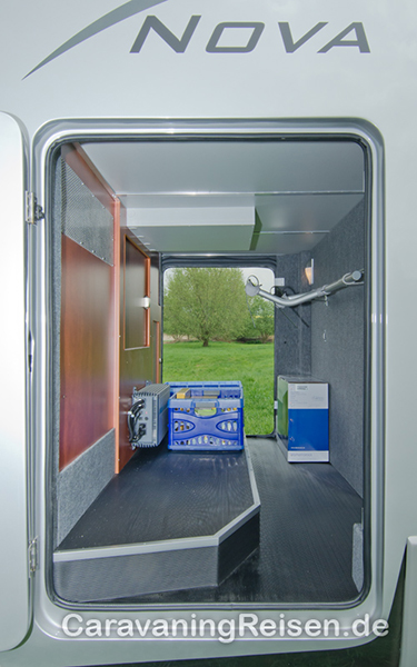 Im Innenraum prägen elegante Möbel, Teppich, Vliesverkleidung an Decken und Wänden, sowie Ablagen und Oberschränke mit Elementen in Milchglasoptik das Erscheinungsbild. Indirekte Beleuchtung sorgt für stimmungsvolles Abendlicht. Das edle Interieur erinnert stark an den Yachtbau. Die L-Sitzgruppe des Nova M bietet mit den drehbaren Fahrerhaussitzen gemütlich Platz für vier Personen um den ausreichend dimensionierten verschiebbaren Tisch. Die Rückenlehne und Sitzfläche der neuen Quersitzbank lassen sich in vier Positionen arretieren: Mit senkrechter Lehne für den Fahrbetrieb und mit zurückgelegter Lehne und vorgerückter Sitzfläche für den Wohnbetrieb. Für bequemes Sitzen in allen Positionen sorgt die konvexe Form der Sitzlehne, die sich dem Rücken anpasst. Die Quersitzbank ist mit zwei Drei-Punkt-Gurten ausgestattet. Ein Fernseher mit DVD-Anlage komplettiert auf Wunsch das Wohnzimmer. Über eine Stufe im Boden geht es in die Küche. Hier befinden sich Dreiflammenkocher mit Piezo-Zünder, Edelstahlspüle, zwei Apothekerauszüge und Oberschränke, drei große Auszüge und ein 80 Liter Kühlschrank. Ein pfiffiges Detail ist die zusätzliche Arbeitsfläche, die unter dem Heckbett herausgezogen wird.