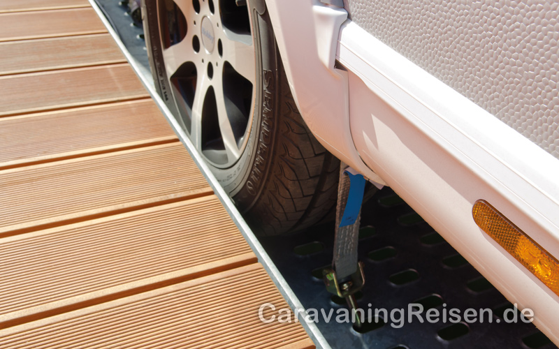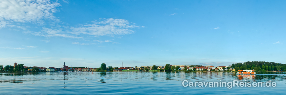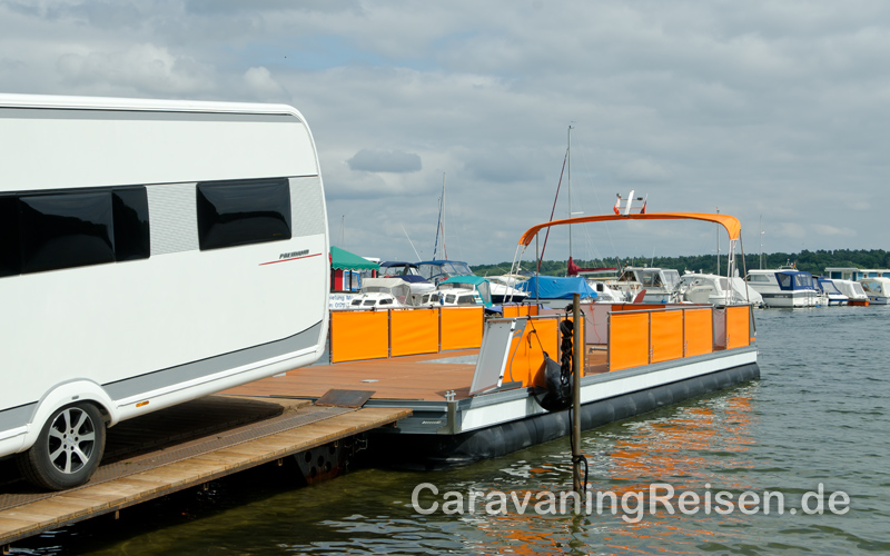 Wer die Müritz einmal vom Wasser her erleben möchte, aber trotzdem auf den Komfort seines Wohnwagens oder Wohnmobils nicht verzichten will, der ist beim Seecamper richtig. Hier wird das eigene Freizeitfahrzeug auf einem schwimmenden Katamaran verzurrt – dem Seecamper. Dieser wird von einem 60 PS Außenborder angetrieben und über eine Steuerzentrale am Bug gelenkt. Der 12,6 Meter lange und 4 Meter breite Seecamper kann auch ohne Sportbootführerschein gefahren werden. Ausreichend ist ein Charterschein mit einer mindestens 3-stündigen theoretischen und praktischen Einweisung. An die gute Manövrierfähigkeit des Seecampers gewöhnt sich der Freizeitkapitän schnell - Heck- und Bugstrahlruder sei Dank. Nach hinten schaut eine Rückfahrkamera, am Bug sorgen Scheinwerfer für Helligkeit nach Sonnenuntergang. Bei der Orientierung auf der mecklenburgischen Seenplatte hilft ein Navigationsgerät mit Seezeichen. Der Platz an Bord ist großzügig bemessen: ein Wohnwagen oder Wohnmobil bis zu einer Länge von 9,00 Metern und einem Gewicht bis zu 4.500 Kilogramm, zusätzlich 400 Kilogramm Zuladung und bis zu 12 Personen – das alles findet Platz auf dem Seecamper. Legt der Seecamper an Land an, wird er mit 230 Volt Strom aus dem Campingplatz- oder Marinanetz versorgt. Unterwegs sorgen eigene Batterien für die 12 Volt Stromversorgung des Seecampers und des Wohnwagens. Ein 200 Liter großer Tank im Rumpf nimmt die Abwässer des Wohnwagens auf. Der Seecamper fährt auch im Flachwasser, weil sein Tiefgang nur 40 cm beträgt. So erreicht er auch die entlegensten Flecken der Seenplatte, die von Land aus nicht zugänglich sind. Im Liegestuhl sitzend gleitet die Landschaft ruhig vorbei. Das ist Natur pur. Vom Seecamper aus können die Gäste jederzeit im See baden - ein riesiger Swimmingpool direkt vor der Wohnwagentür. Entspannen, angeln, grillen und Sonnenuntergänge bei einem Glas Wein genießen gehören ebenfalls zum Pflichtprogramm an Bord. Von der Müritz-Anlegestelle am Campingpark Kamerun in Waren lassen sich verschiedene Touren vom kurzen Wochenendtrip bis zur mehrwöchigen Reise antreten. Zwei Seecamper warten dort auf Freizeitmatrosen. Fest machen können die Urlaubskapitäne mit dem Seecamper an jeder geeigneten Anlegestelle, gleich ob Marina oder Campingplatz, in der Region. Die Chartergebühr für eine Woche beträgt je nach Saison zwischen 600 und 1100 Euro.